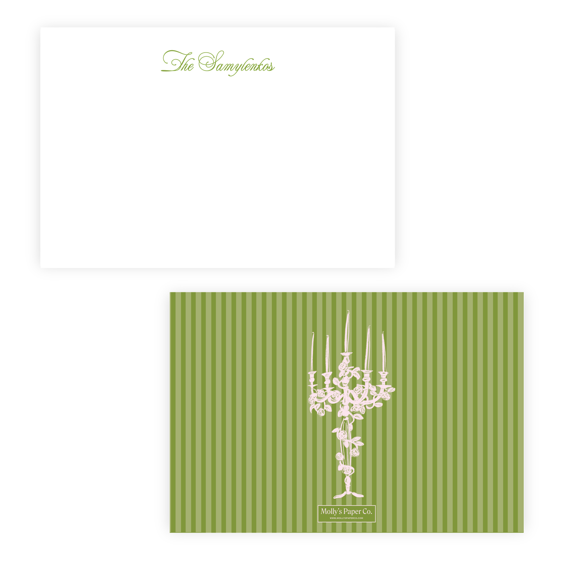 Add a touch of timeless elegance to your correspondence with our Candelabra Notecard Set, featuring a delicate, hand-illustrated chandelier paired with classic green pinstripes. Personalized with your family name or custom text, this stationery feels both elevated and inviting—perfect for thank-you notes, hostess gifts, or everyday letters that deserve something special. Designed for those who appreciate traditional charm with a fresh, modern sensibility.