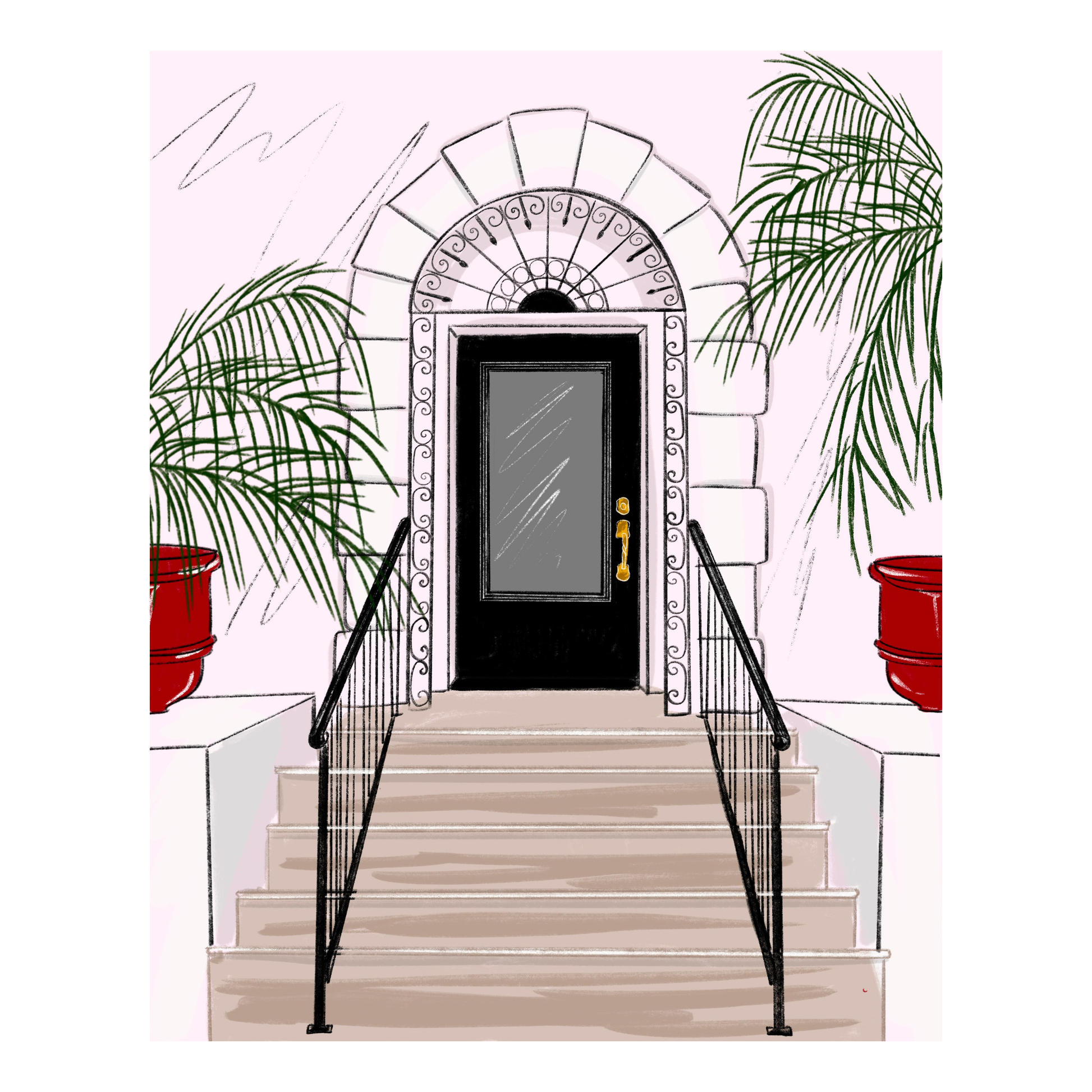 There's something about a perfect front door that just feels like home. This original hand-illustrated art print captures the quiet elegance of a classic American entryway — black lacquer door, ornate ironwork, flanking palms in terracotta pots, stone steps leading somewhere wonderful. Printed and framed in a standard 8x10 frame, it belongs in a foyer, living room, or anywhere that deserves a little sophistication on the wall.