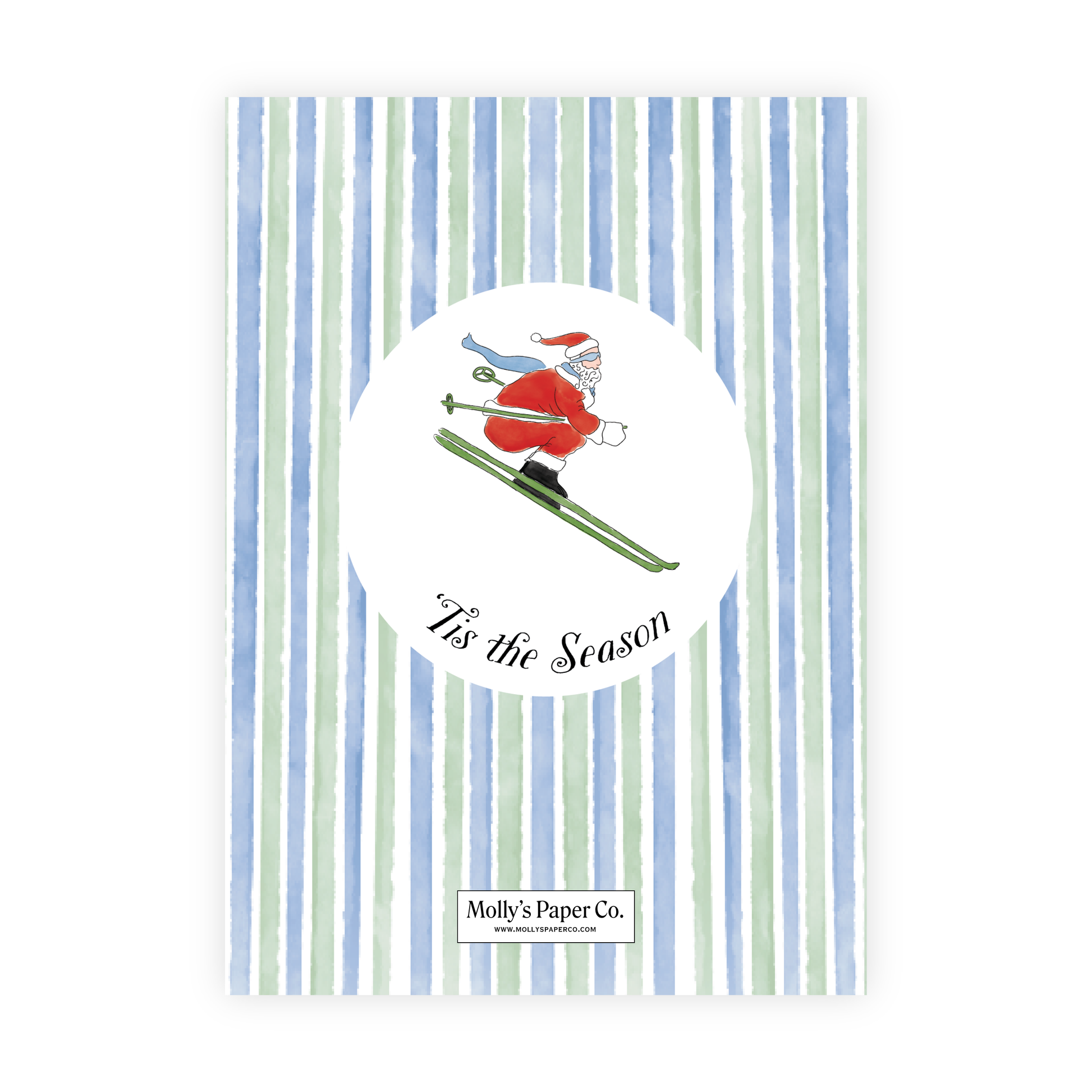 Spread cheer from the slopes with our Skiing Santa Holiday Photo Card! Featuring a jolly Santa mid-ski on watercolor stripes of wintry blue and green, this design brings a playful yet timeless touch to your holiday greetings. With room to include a favorite family photo and a heartfelt message, it’s the perfect way to send joy, laughter, and warmth this season.